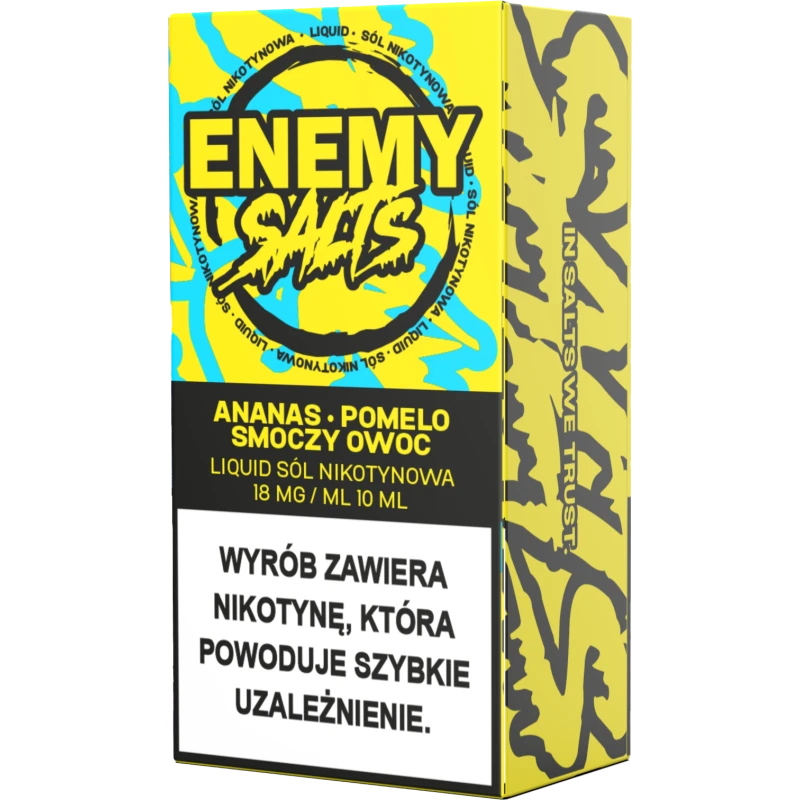 Liquid Enemy Salt 10ml – Ananas, Pomelo, Smoczy Owoc 18mg/ml to e-liquid na bazie soli nikotynowej, przeznaczony do użytku w e-papierosach. Połączenie soczystego ananasa, orzeźwiającego pomelo i egzotycznego smoczego owocu tworzy wyrazistą, tropikalną kompozycję smakową o słodko-cytrusowym charakterze.