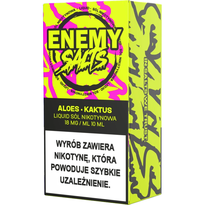 Liquid Enemy Salt 10ml – Aloes, Kaktus 18mg/ml to e-liquid na bazie soli nikotynowej, przeznaczony do użytku w e-papierosach. Łączy delikatnie orzeźwiający smak aloesu ze słodkim, egzotycznym aromatem kaktusa, tworząc harmonijną i subtelnie owocową kompozycję.