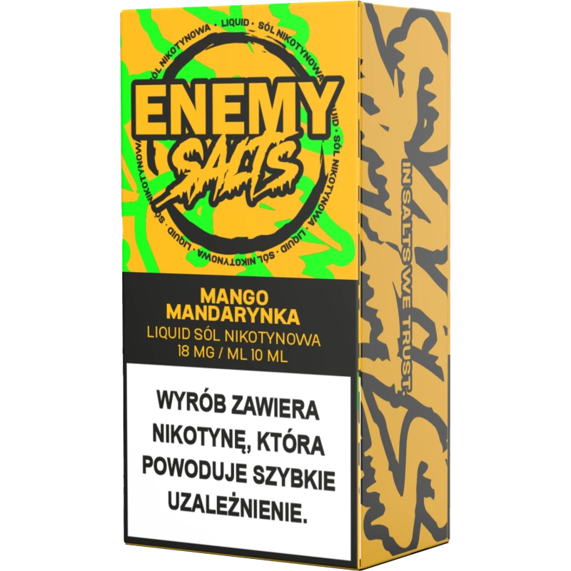 Liquid Enemy Salt 10ml – Mango, Mandarynka to e-liquid na bazie soli nikotynowej, przeznaczony do użytku w e-papierosach. Zawiera połączenie soczystego mango o tropikalnej słodyczy z orzeźwiającą, lekko kwaskowatą mandarynką, tworząc intensywnie owocowy i dobrze zbalansowany profil smakowy.