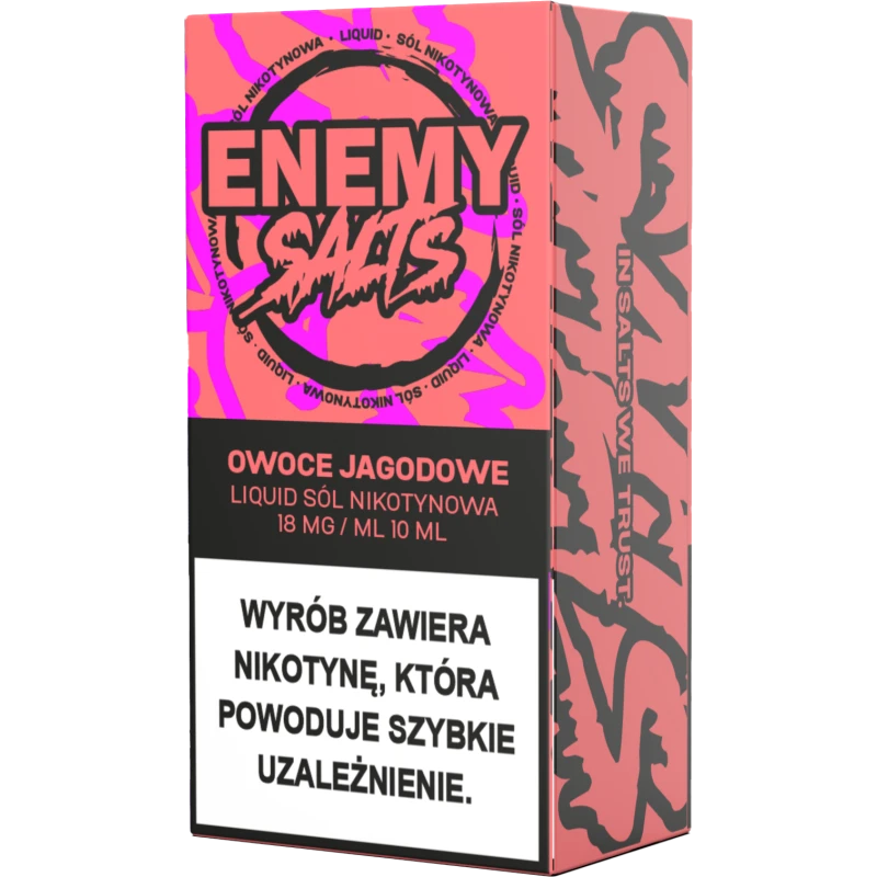 Liquid Enemy Salt 10ml – Owoce Jagodowe 18mg/ml to e-liquid na bazie soli nikotynowej, przeznaczony do użytku w e-papierosach. Charakteryzuje się intensywnym, owocowym profilem, łączącym słodkie i lekko kwaskowate nuty różnych owoców jagodowych, co tworzy złożoną i wyrazistą kompozycję smakową.