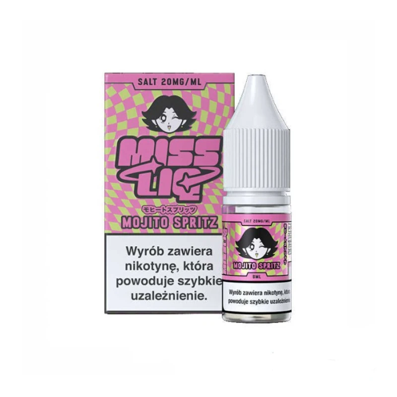 Liquid MISS LIQ Salts Mojito Spritz to kompozycja inspirowana cytrusowo-miętowym profilem smakowym znanym z popularnych napojów typu spritz. Wyczuwalna nuta limonki łączy się z aromatem mięty, tworząc świeży i lekko cytrusowy charakter. Całość jest zbalansowana i delikatnie orzeźwiająca.